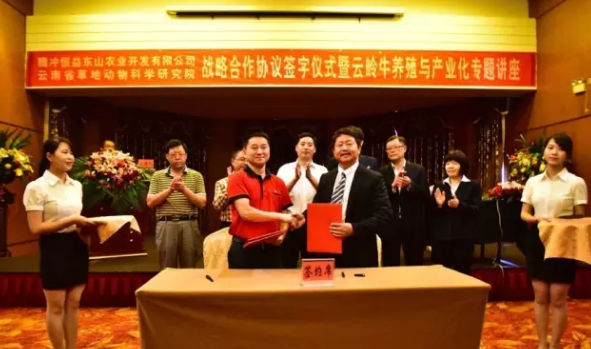 在出席儀式的市政領導、與會嘉賓和集團高管的見證下,段治葵董事長與黃必志院長簽訂了開發(fā)東山旅游度假區(qū)歷史性的戰(zhàn)略合作協(xié)議。并聘請黃必志院長為騰沖恒益東山農(nóng)業(yè)開發(fā)有限公司首席專家,聘請孫寶忠研究員為騰沖恒益東山農(nóng)業(yè)開發(fā)有限公司牛肉系列產(chǎn)品研發(fā)首席專家。這一重大戰(zhàn)略合作協(xié)議的簽訂及兩位國內(nèi)業(yè)界知名專家的加入,為開發(fā)東山旅游度假區(qū)落地實施提供了堅實的學術(shù)保障和技術(shù)支持。