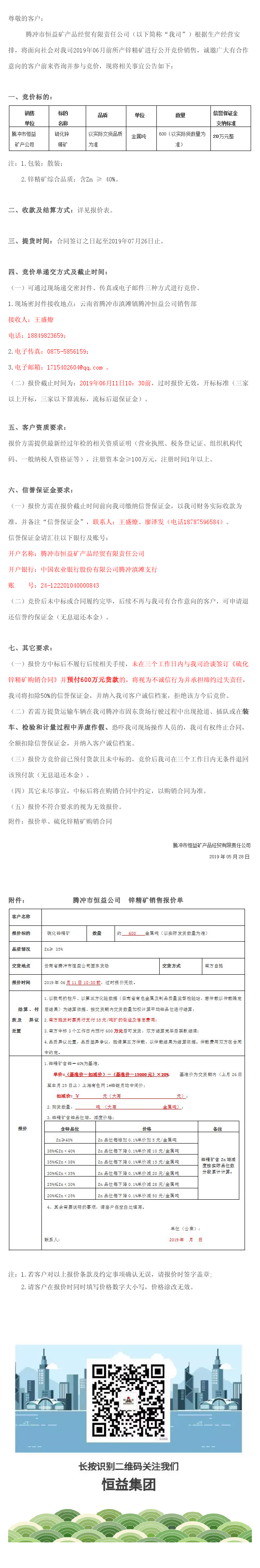 騰沖市恒益礦產(chǎn)品經(jīng)貿(mào)公司關(guān)于鋅精礦競價(jià)銷售公告(201904)號(hào) 來源: 瀏覽量:8896 日期:2019-05-28 分享到: 上一篇:高黎貢國際健康旅居小鎮(zhèn)低層住宅八組團(tuán)-江山小院精裝樣板房裝修施工工程招標(biāo)公告 下一篇:騰沖市恒益礦產(chǎn)品經(jīng)貿(mào)公司關(guān)于鋅精礦競價(jià)銷售公告(201903)號(hào)
