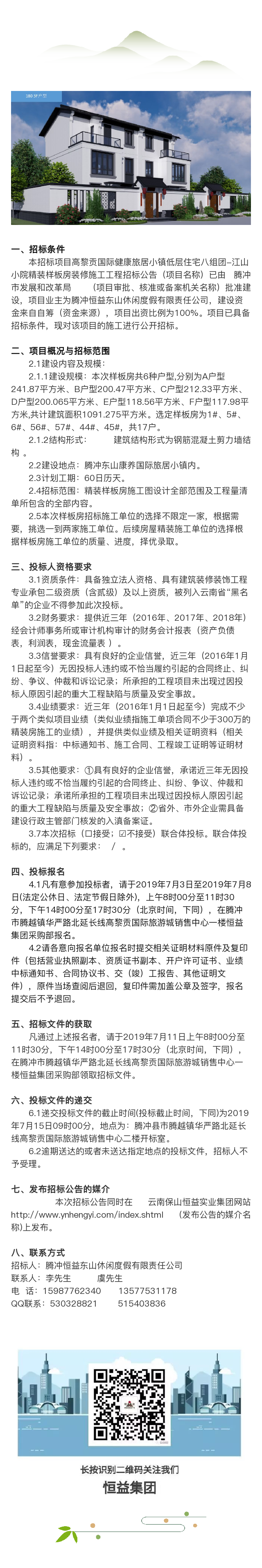 高黎貢國(guó)際健康旅居小鎮(zhèn)低層住宅八組團(tuán)-江山小院精裝樣板房裝修施工工程招標(biāo)公告 來(lái)源: 瀏覽量:9879 日期:2019-07-04 分享到: 上一篇:高黎貢國(guó)際健康旅居小鎮(zhèn)低層住宅八組團(tuán)—江山小院門頭及圍墻工程招標(biāo)公告 下一篇:騰沖市恒益礦產(chǎn)品經(jīng)貿(mào)公司關(guān)于鋅精礦競(jìng)價(jià)銷售公告(201904)號(hào)