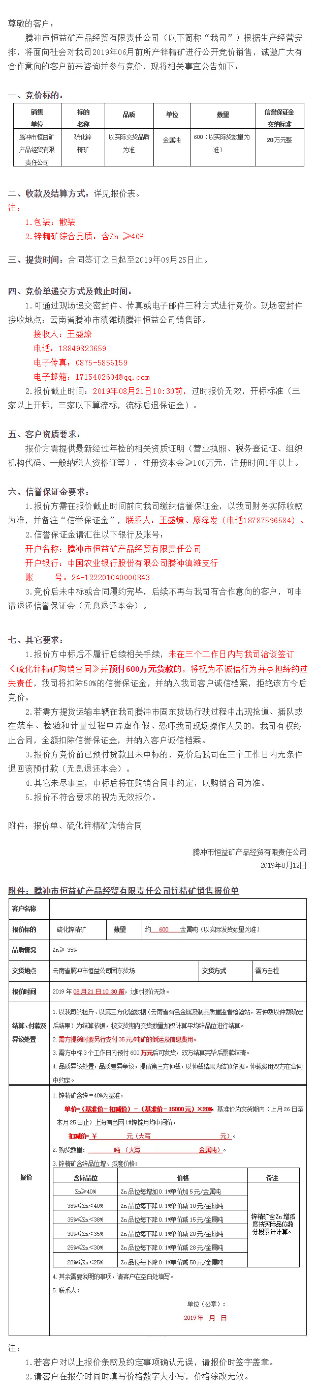 騰沖市恒益礦產(chǎn)品經(jīng)貿(mào)有限責(zé)任公司關(guān)于鋅精礦競價銷售公告(201905)號 來源: 瀏覽量:9810 日期:2019-08-13 分享到: 上一篇:騰沖市恒益礦產(chǎn)品經(jīng)貿(mào)有限責(zé)任公司關(guān)于鋅精礦競價銷售公告(201905)號 下一篇:高黎貢國際健康旅居小鎮(zhèn)低層住宅八組團(tuán)—江山小院門頭及圍墻工程招標(biāo)公告