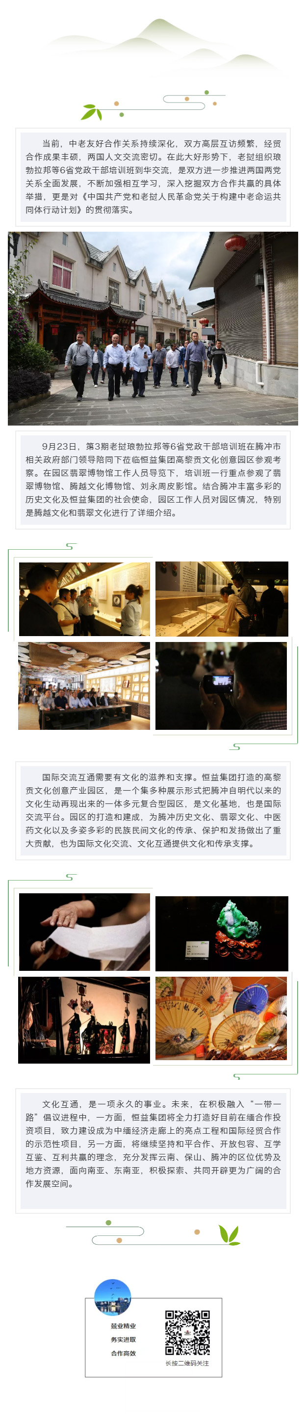 第3期老撾瑯勃拉邦等6省黨政干部培訓(xùn)班蒞臨高黎貢文化創(chuàng)意園區(qū)參觀考察 來(lái)源: 瀏覽量:7754 日期:2019-09-24 分享到: 上一篇:騰沖市副市長(zhǎng)李屏一行蒞臨恒益健康體檢中心調(diào)研指導(dǎo) 下一篇:商務(wù)部紀(jì)檢監(jiān)察穩(wěn)外貿(mào)調(diào)研組蒞臨恒益集團(tuán)調(diào)研