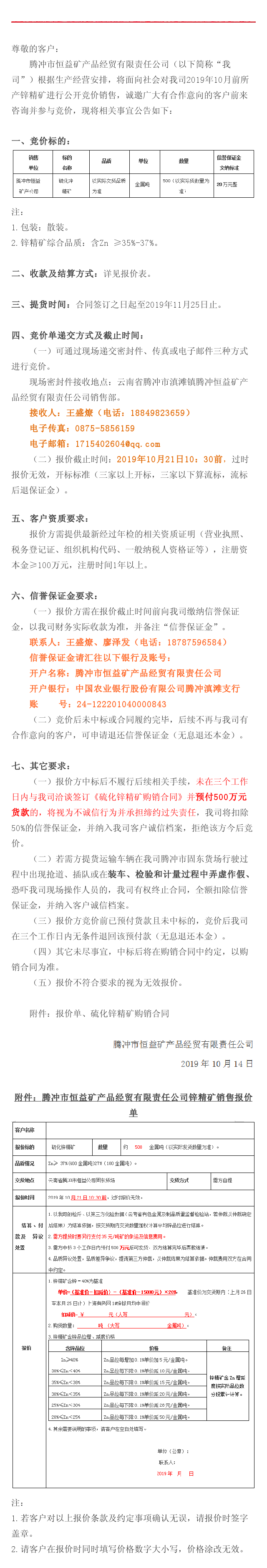騰沖市恒益礦產(chǎn)品經(jīng)貿(mào)有限責(zé)任公司關(guān)于鋅精礦競價(jià)銷售公告(201905)號(hào) 來源: 瀏覽量:9217 日期:2019-10-14 分享到: 上一篇:騰沖市恒益礦產(chǎn)品經(jīng)貿(mào)有限責(zé)任公司關(guān)于鋅精礦競價(jià)銷售公告(201910)號(hào) 下一篇:騰沖市恒益礦產(chǎn)品經(jīng)貿(mào)有限責(zé)任公司關(guān)于鋅精礦競價(jià)銷售公告(201905)號(hào)