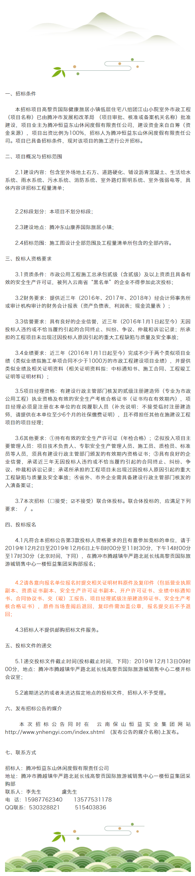 高黎貢國際健康旅居小鎮(zhèn)低層住宅八組團(tuán)江山小院室外市政工程施工招標(biāo)公告 來源: 瀏覽量:9735 日期:2019-12-02 分享到: 上一篇:高黎貢國際健康旅居小鎮(zhèn)低層住宅八組團(tuán)——景秀東山A區(qū)建筑消防工程施工招標(biāo)公告 下一篇:騰沖市恒益礦產(chǎn)品經(jīng)貿(mào)有限責(zé)任公司關(guān)于鋅精礦競價銷售公告(201911)號