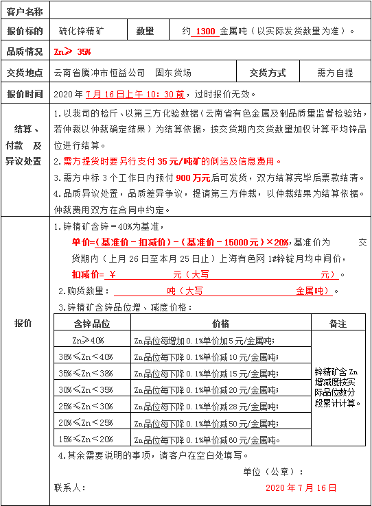 附件:騰沖市恒益礦產(chǎn)品經(jīng)貿(mào)有限責(zé)任公司鋅精礦銷售報(bào)價(jià)單