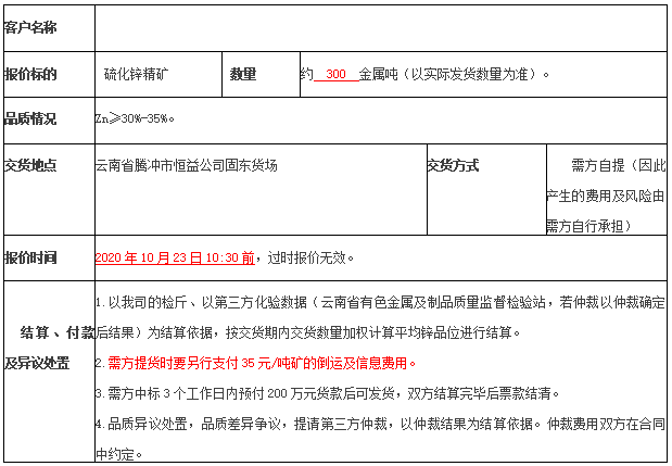 附件 騰沖市恒益礦產(chǎn)品經(jīng)貿(mào)有限責(zé)任公司 鋅精礦銷售報(bào)價(jià)單
