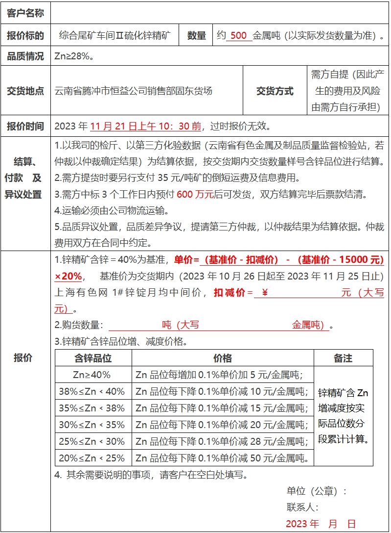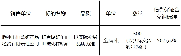 騰沖市恒益礦產(chǎn)品經(jīng)貿(mào)有限責(zé)任公司關(guān)于鋅精礦競(jìng)價(jià)銷售公告(202310)號(hào)