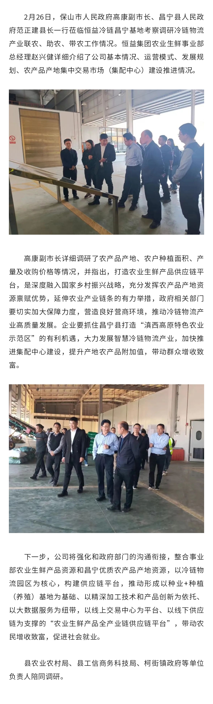 加快打造農(nóng)業(yè)生鮮產(chǎn)品供應(yīng)鏈平臺(tái) 帶動(dòng)群眾增收致富 來(lái)源: 瀏覽量:3753 日期:2024-02-27 分享到: 上一篇:馬子興到恒益集團(tuán)召開騰沖市服務(wù)企業(yè)推進(jìn)項(xiàng)目建設(shè)座談會(huì) 下一篇:龍騰盛世,共舞新春丨恒益集團(tuán)受邀參加緬甸華僑界龍年新春慶典