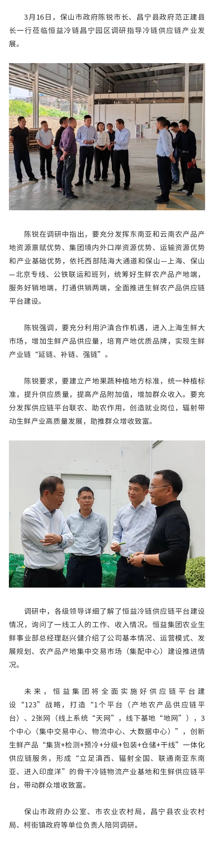 保山市政府主要領(lǐng)導(dǎo)蒞臨昌寧冷鏈物流園區(qū)調(diào)研指導(dǎo)工作 來源: 瀏覽量:3708 日期:2024-03-18 分享到: 上一篇:2024騰沖科學(xué)家論壇——“地?zé)豳Y源與溫泉醫(yī)康養(yǎng)產(chǎn)業(yè)發(fā)展”院士講壇成功舉辦 下一篇:“共建西部陸海大通道,共享南向開放新機(jī)遇”交流活動成功舉辦