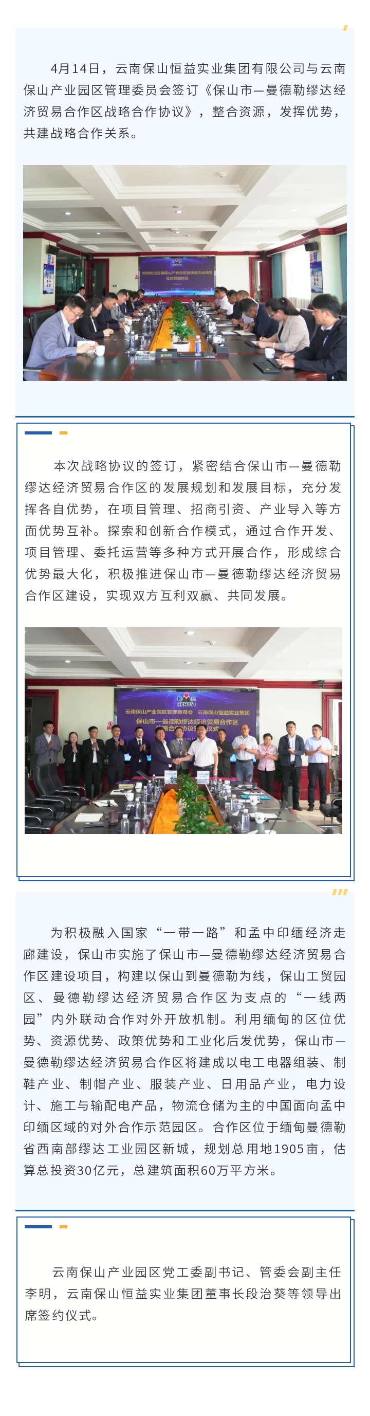云南保山恒益實(shí)業(yè)集團(tuán)有限公司與云南保山產(chǎn)業(yè)園區(qū)管理委員會(huì)簽訂戰(zhàn)略合作協(xié)議 來(lái)源: 瀏覽量:3902 日期:2024-04-15 分享到: 上一篇:恒益集團(tuán)董事長(zhǎng)段治葵率隊(duì)赴緬甸曼德勒考察,簽署“光伏項(xiàng)目”合作協(xié)議 下一篇:騰沖翡翠博物館舉辦《翡翠的發(fā)現(xiàn)》 專題文化論壇