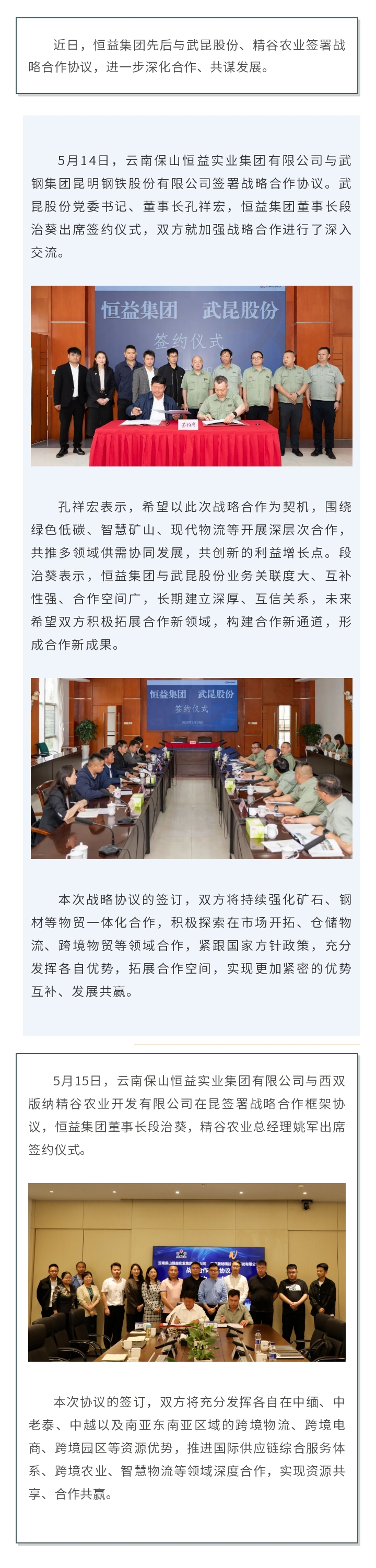 恒益集團分別與武昆股份、精谷農(nóng)業(yè)簽署合作協(xié)議 來源: 瀏覽量:3812 日期:2024-05-16 分享到: 上一篇:云南省商務(wù)廳副廳長馬俊一行蒞臨恒益集團物流項目調(diào)研指導(dǎo) 下一篇:“知見行杯·奔跑吧少年”2024年騰沖市第七屆小學生校園籃球聯(lián)賽圓滿落幕