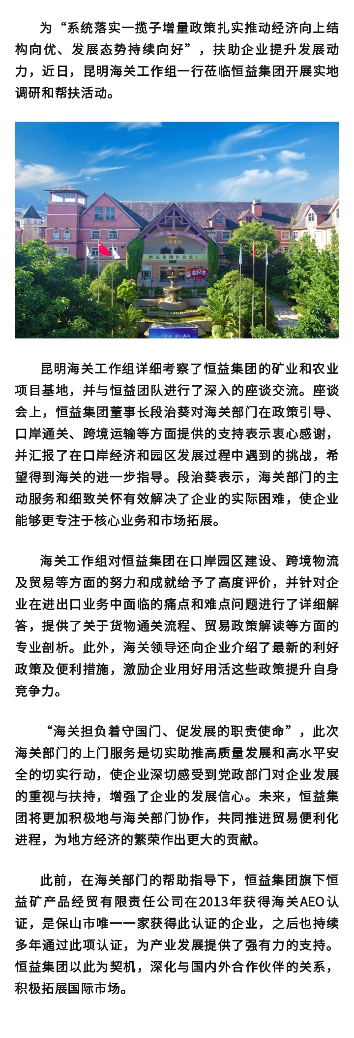 助企幫扶丨昆明海關(guān)工作組一行蒞臨恒益集團(tuán)調(diào)研指導(dǎo) 來源: 瀏覽量:3321 日期:2024-10-21 分享到: 上一篇:國貨品牌玫卿序閃耀巴黎“創(chuàng)新匹亞”大賽,榮獲INPD國際創(chuàng)新配方獎 下一篇:中共騰沖市委副書記、市長楊艷龍帶隊蒞臨恒益集團(tuán)調(diào)研指導(dǎo)
