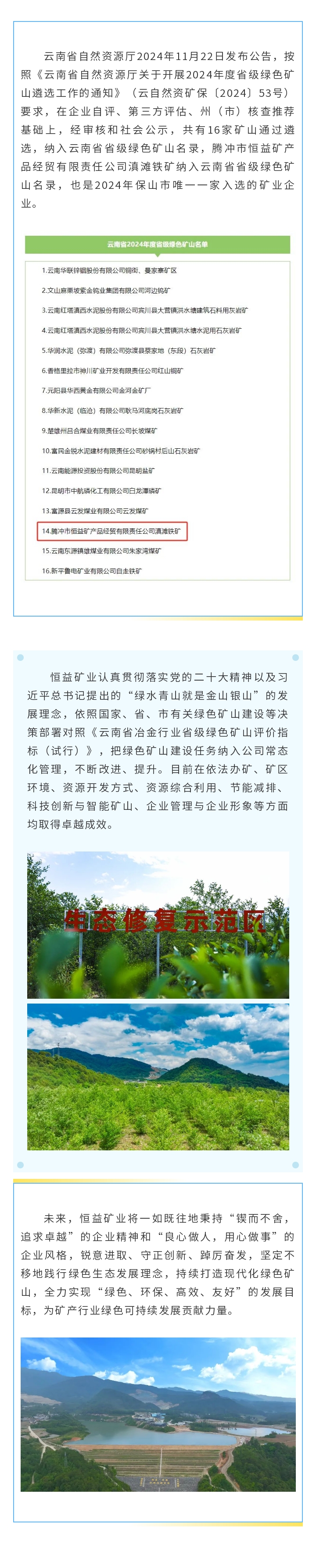 恒益礦業(yè)滇灘鐵礦成功入選云南省省級綠色礦山名錄 來源: 瀏覽量:3117 日期:2024-11-25 分享到: 上一篇:恒益集團(tuán)“薪火計(jì)劃2.0”:專業(yè)打磨與管理優(yōu)化并行,驅(qū)動持續(xù)發(fā)展新引擎 下一篇:喜訊!恒益集團(tuán)獲得“2024云南企業(yè)100強(qiáng)”等多項(xiàng)榮譽(yù)獎項(xiàng)