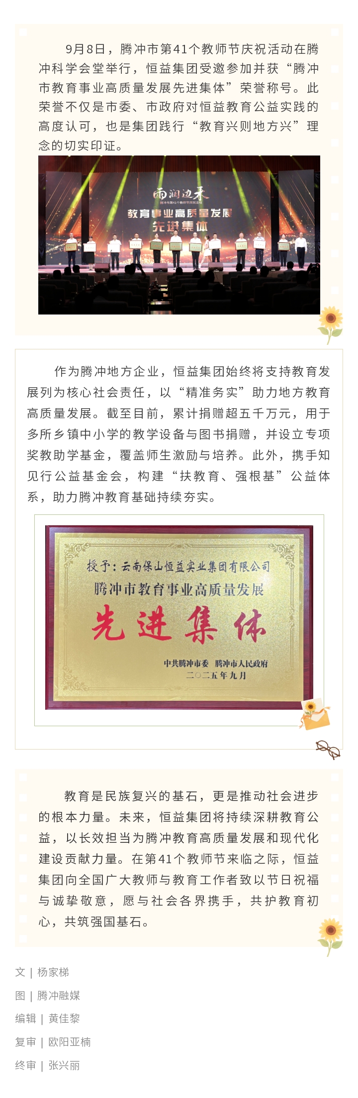 喜訊丨恒益集團(tuán)榮膺2025年“騰沖市教育事業(yè)高質(zhì)量發(fā)展先進(jìn)集體”稱號(hào) 來(lái)源: 瀏覽量:805 日期:2025-09-08 分享到: 上一篇:恒益集團(tuán)與省心說(shuō)科技達(dá)成合作 共筑微信電商新生態(tài) 下一篇:恒益集團(tuán)濱鯤中智與猴橋鎮(zhèn)簽約 共筑高原高端淡水魚養(yǎng)殖基地