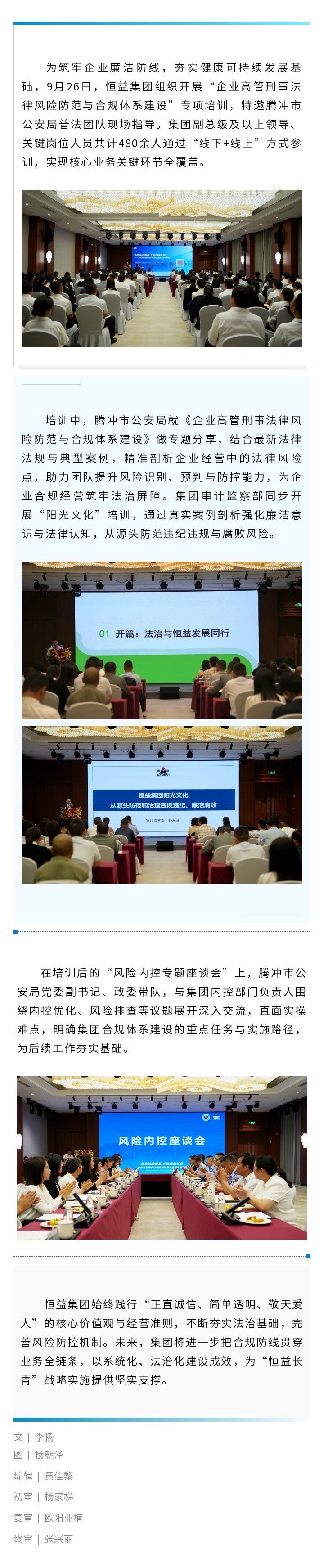 恒益集團開展高管刑事法律風險防范與合規(guī)體系建設專項培訓 來源: 瀏覽量:564 日期:2025-09-28 分享到: 上一篇:恒益集團黨委赴松山抗戰(zhàn)遺址開展主題黨日活動 下一篇:榮登雙榜!恒益集團榮獲2025云南民企百強第30位、服務業(yè)20強第8位